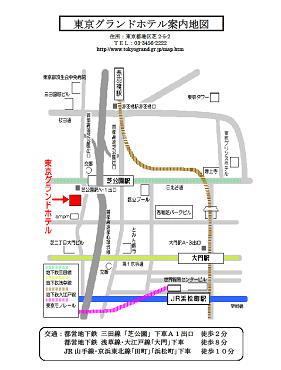 | 会 場 | 「東京グランドホテル/蘭菊の間」 <アクセス> 都営地下鉄 三田線「芝公園」下車 Å-1出口 徒歩2分 都営地下鉄浅草線・大江戸線「大門」下車 徒歩8分 JR 山手線・京浜東北線「田町」「浜松町」下車 徒歩10分 |