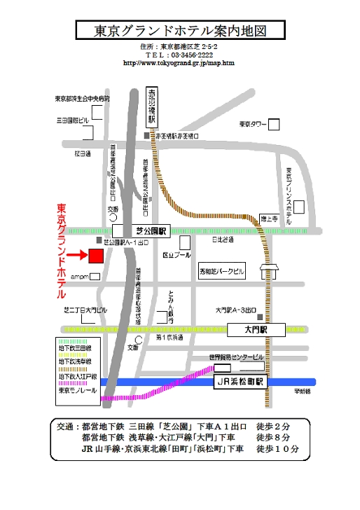 | 会 場 | 「東京グランドホテル/桜の間」 東京都港区芝2-5-2 <アクセス> 都営地下鉄 三田線「芝公園」下車 Å-1出口 徒歩2分 都営地下鉄浅草線・大江戸線「大門」下車 徒歩8分 JR 山手線・京浜東北線「田町」「浜松町」下車 徒歩10分 |