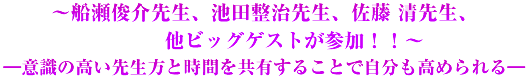 | 定 員 | 先着70名様 ※ゲストの先生方が約10名参加されるため実質60名様となります。 |